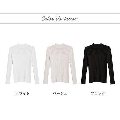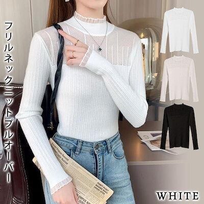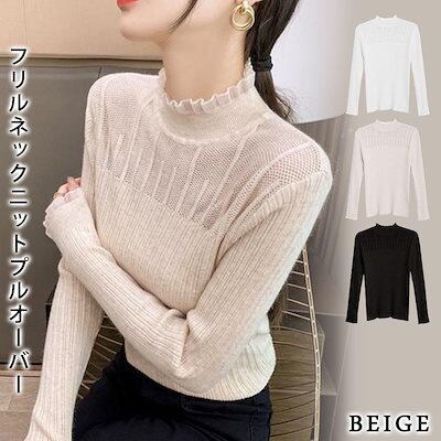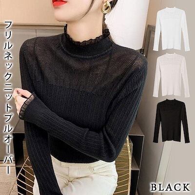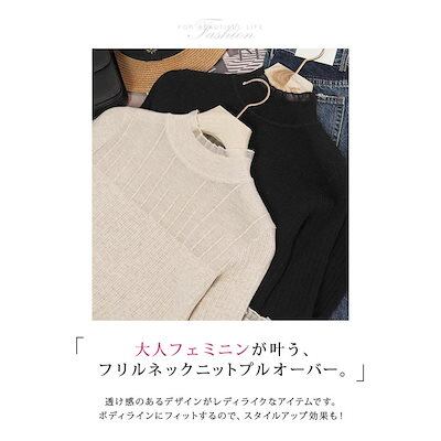 ニットトップスレディース黒白ニットフリルトップスリブ長袖リブニットセーターベージュホワイトブラック3040