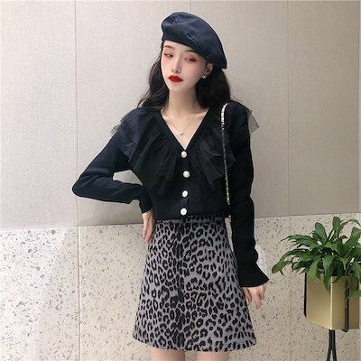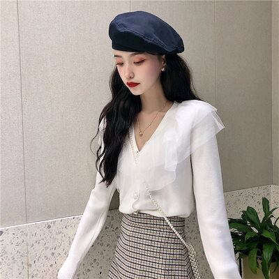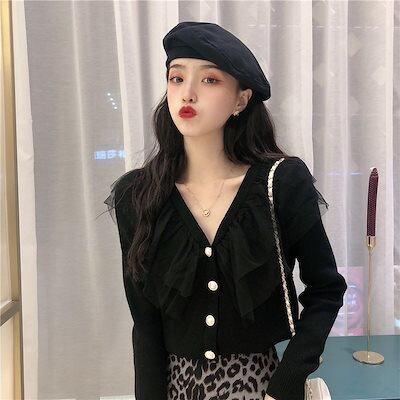 韓国レディース ファッションとメッシュフリルニットセータールーズVネックカーディガンアウタージャケット