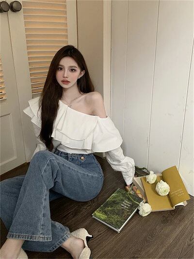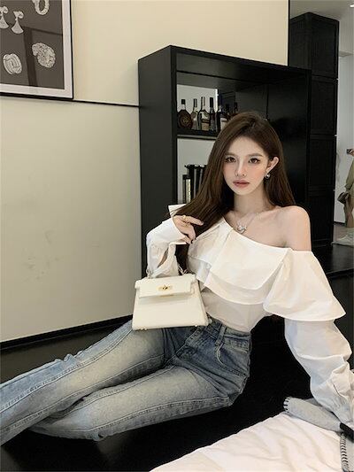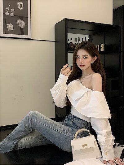 スタイル フリル 長袖 デザインセンス オフショルダー スリム 快適である レディース シャツ 気質 上着