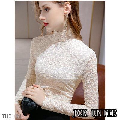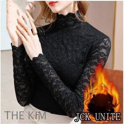 レースブラウス レディース 裏起毛 総レース インナー 立ち襟 ハイネック トップス フリル袖口 厚手 きれいめ 通勤 シンプル おしゃれ 秋 冬