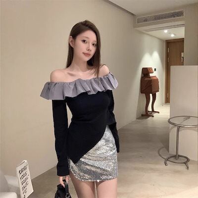 2025 春 韓国 スイート ホットガール ワンショルダー フリル イレギュラー ドローストリング オールマッチ ウエスタンスタイル レディース トップス