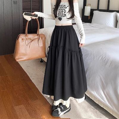 伸縮性のあるウエストのフリルレースパッチワークスカートレディース春夏新作ハイウエストスリムAラインスーツロングスカート