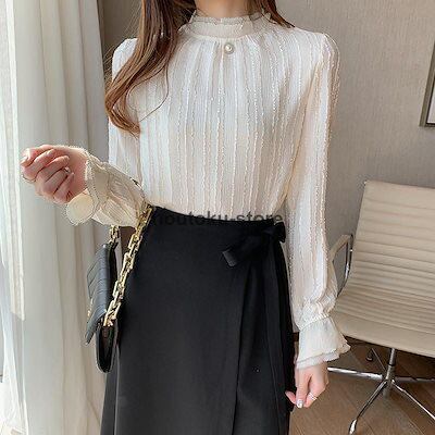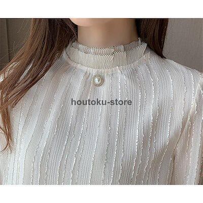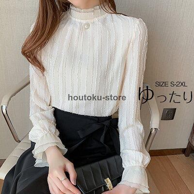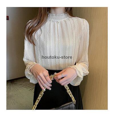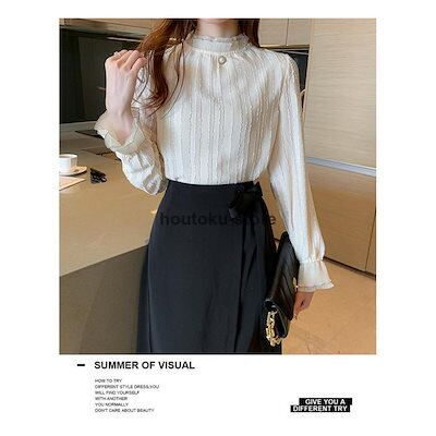 ブラウス レディース シャツ 長袖 レース パフスリーブ インナー ハイネック フリル 無地 切り替え オフィス 着痩せ 大人 上品 通勤 OL 春秋