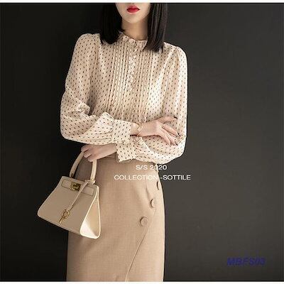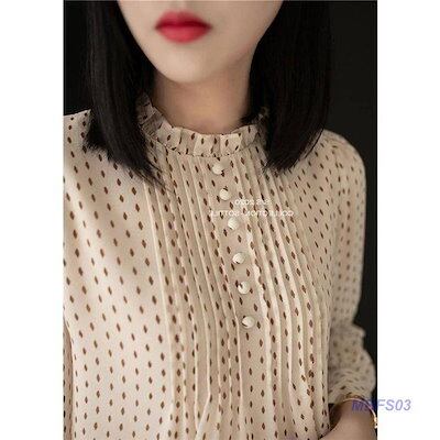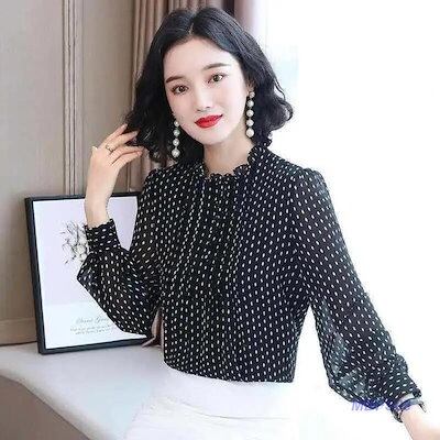 ブラウス レディース シャツ 長袖 オフィスブラウス シフォン 春秋 ハイネック ドット柄 フリル ゆったり 大きいサイズ 韓国風 上品 通勤 OL
