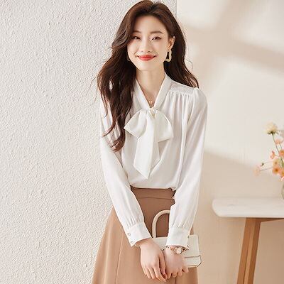 韓国ファッション大きいサイズレディース可愛いリボン襟シャツブラウス職業通勤インナー長袖トップスシャツ2025春服新作カーディガンフレンチ高級感