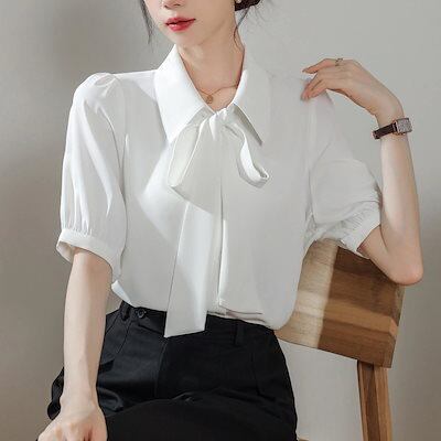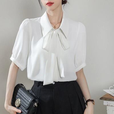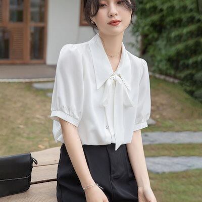 ホワイトシフォンリボンシャツレディース半袖夏デザインニッチ香港スタイル通勤プロフェッショナルトップ多用途レース