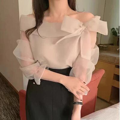 通勤 ブラウス2025新作韓国ファッションレディース リボン本 プラクスオフショルダー ブラウス
