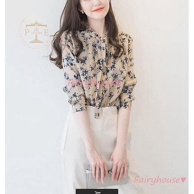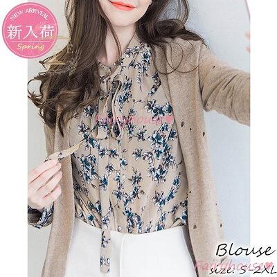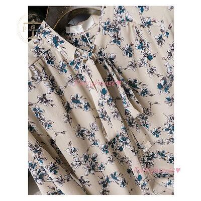 人気商品ブラウス レディース 長袖ブラウス 春夏 オフィスブラウス 花柄 リボンVネック オシャレブラウス シフォントップス 韓国風 大人 通勤 ゆったりシャツ 40代 30代