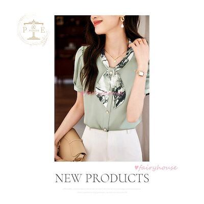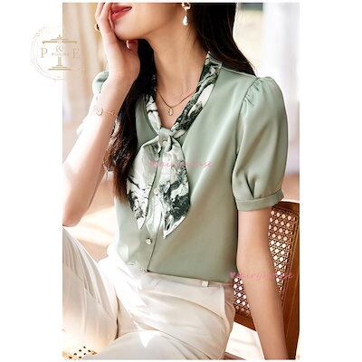 今月のみ ブラウス レディース 半袖ブラウス 夏 オフィスブラウス プリント リボンVネック オシャレブラウス レショントップス 韓国風 通勤OL ゆったりシャツ 40代 30代