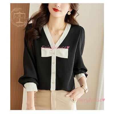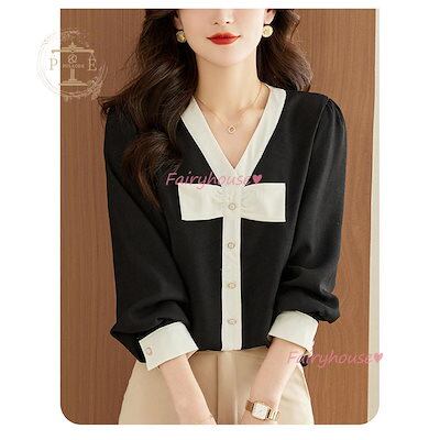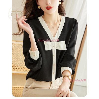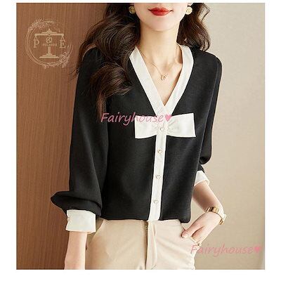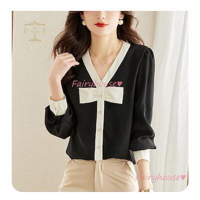 今人気 ブラウス レディース 長袖ブラウス 春秋 オフィスブラウス リボンVネック オシャレブラウス シフォントップス 韓国風 大人 通勤OL ゆったりシャツ 40代 30代
