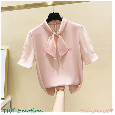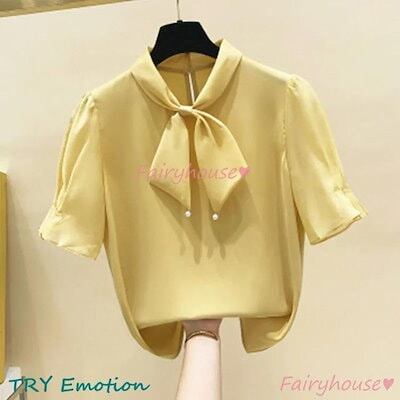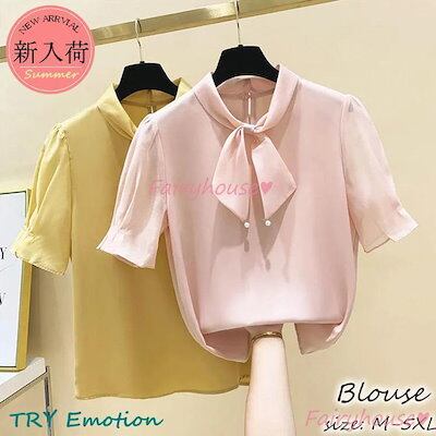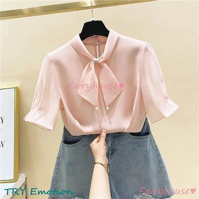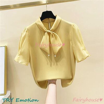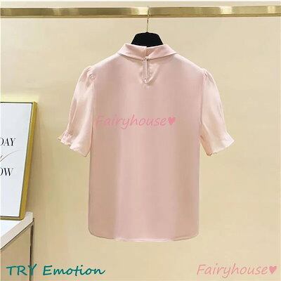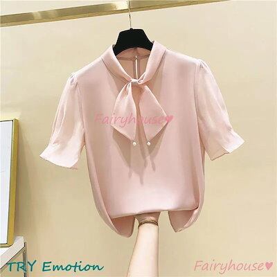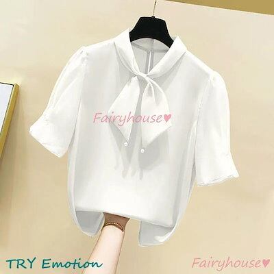 ブラウス レディース 半袖ブラウス 春夏 オフィスブラウス 白リボンネック オシャレブラウス シフォントップス 韓国風 大人 上品 通勤OL ゆったりシャツ 40代