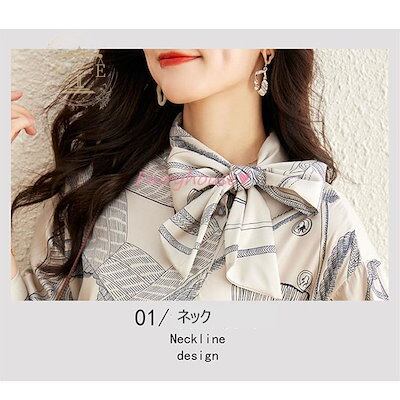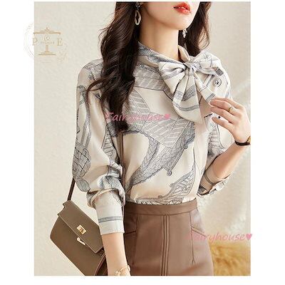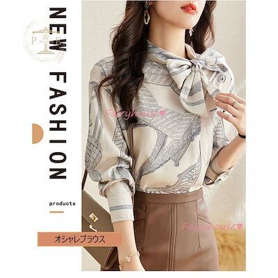 ブラウス レディース 長袖ブラウス 春秋 オフィスブラウス リボンネック オシャレブラウス プリントトップス 韓国風 大人 通勤OL ゆったりシャツ 40代 30代 50代