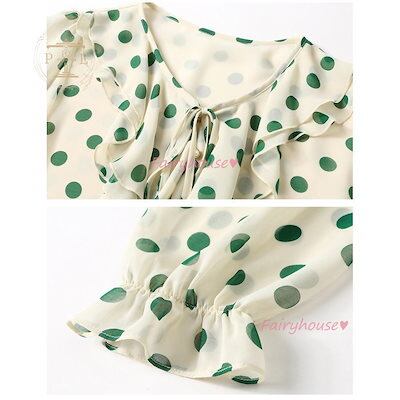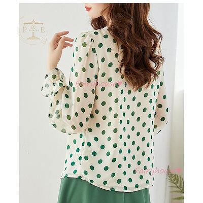 ブラウス レディース 長袖ブラウス 春夏 オフィスブラウス ドット柄 リボンフレア Vネック オシャレブラウス シフォントップス 韓国風 大人 通勤OLシャツ40代