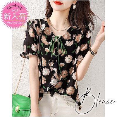 ブラウス レディース 40代 夏 オシャレブラウス 韓国風 半袖トップス リボン 花柄シフォンシャツ パフスリーブブラウス フレア袖トップス ゆったりtシャツ 上品