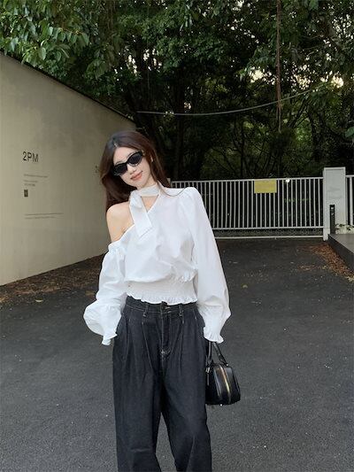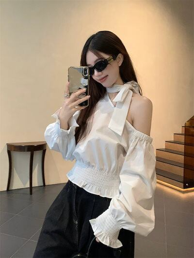 2025春夏トップス シャツ 長袖 ワンショルダー 肩見せ リボン 秋 白 ホワイト おしゃれ かわいい きれいめ 大人っぽい 韓国ファッション レディース お出かけ