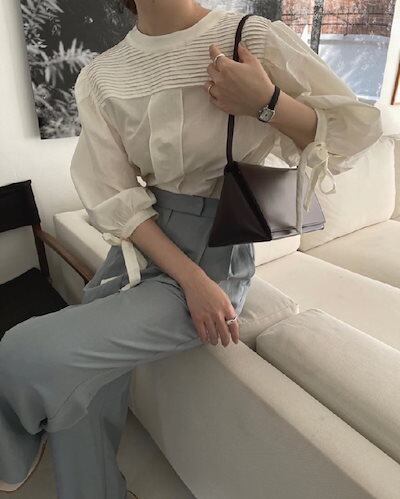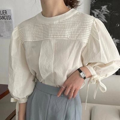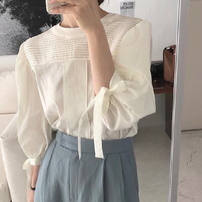 2025春夏トップス シャツ リボン ラウンドネック プリーツ 長袖 ゆったり 秋 白 茶色 おしゃれ かわいい ガーリー キュート 甘め 韓国ファッション レディース お出かけ