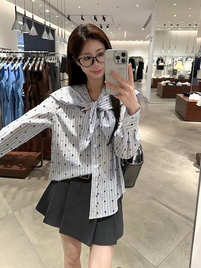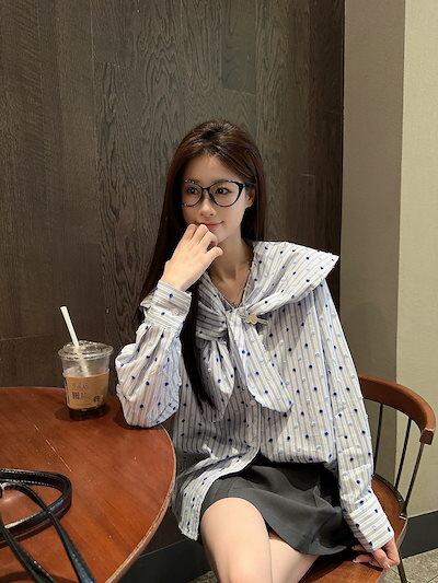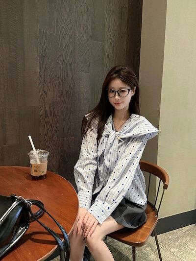 2025 春夏トップス シャツ 長袖 ストライプ ボタン 襟 ピューリタンカラー セーラー襟 リボン 秋 青 ブルー おしゃれ かわいい 韓国ファッション レディース お出かけ