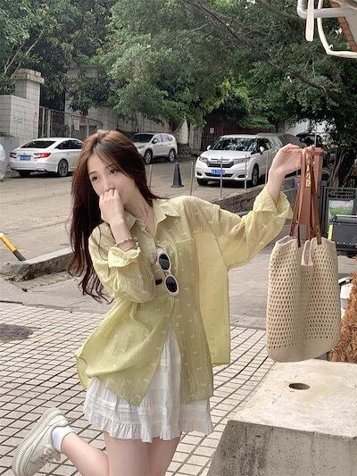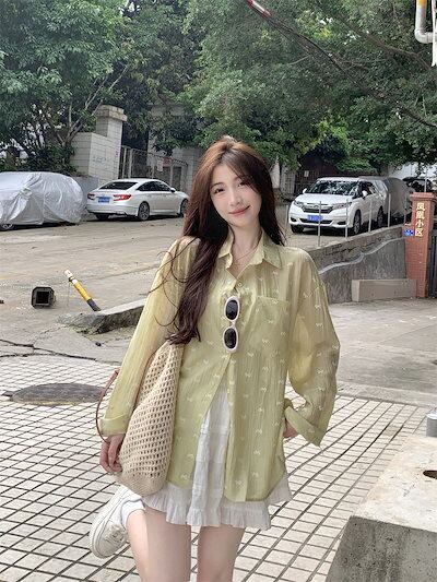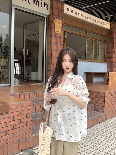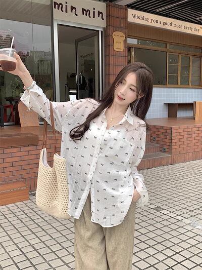 シフォンブラウスリボン花柄カジュアル外着長袖トップスレディース春2025新作韓国版ゆったり薄手日焼け止めシャツ