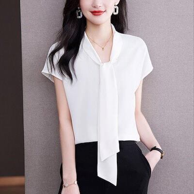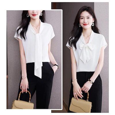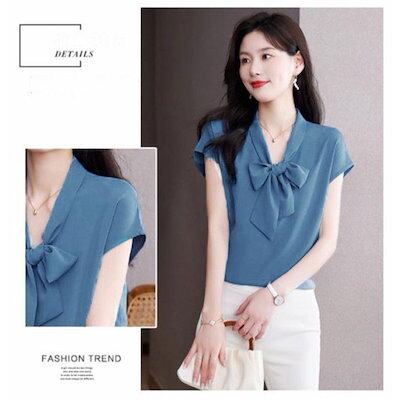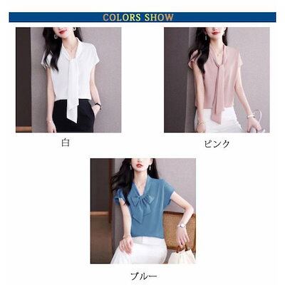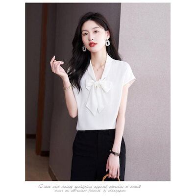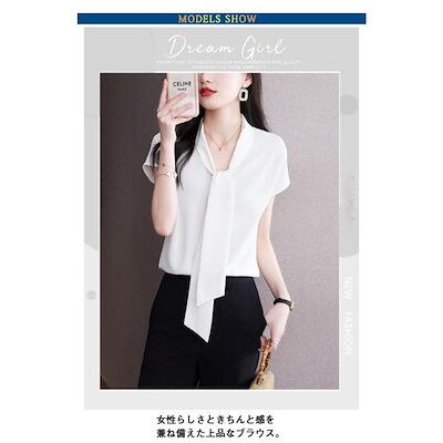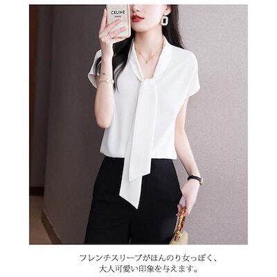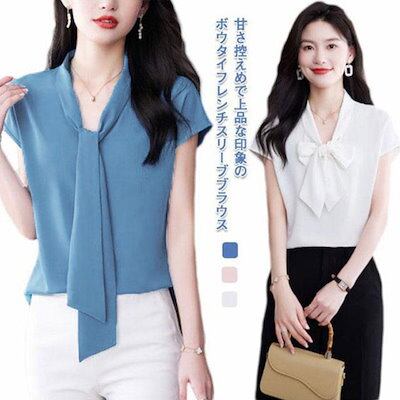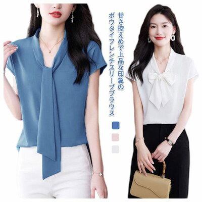 ボウタイブラウス ブラウス ボウタイ 半袖 レディース トップス リボン リボンブラウス フレンチスリーブ フォーマル オフィス カジュアル ビジネ