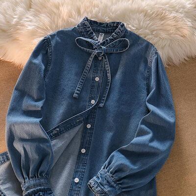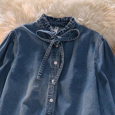夏の準備!ブラウス レディース トップス シャツ デニム 立ち襟 フリル リボン ボウタイ 長袖 春 春服