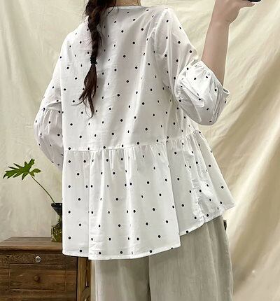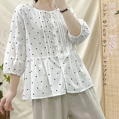 半袖シャツ ブラウス 綿 レディース トップス フレア シャツ 七分袖 春夏 綿シャツ 大人可愛い 白 薄手 ドット柄 コットンブラウス クルーネック 大きいサイズ ボリュームスリーブ ボタン 前開き
