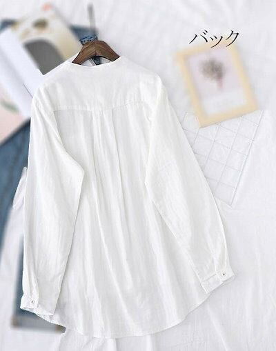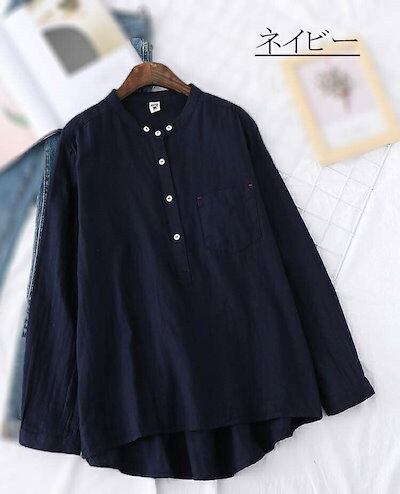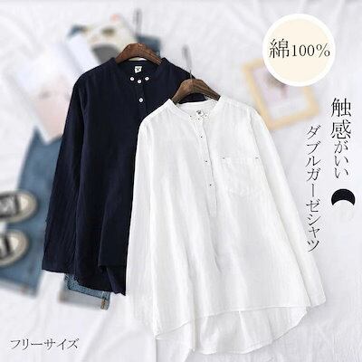 ダブルガーゼ シャツ レディース チュニック ブラウス ガーゼシャツ ロング 長袖 コットン 綿100% カジュアルシャツ 立ち襟 バンドカラーシャツ 前開け ボタン留め 長袖シャツ コットンシャツ