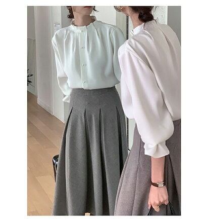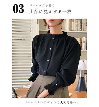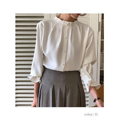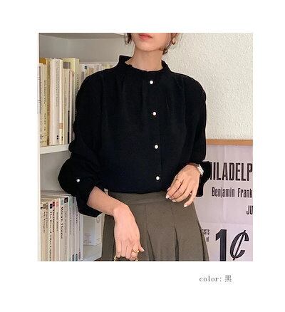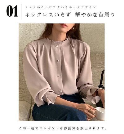 シャツ パール付き ブラウス フォーマル きれいめ 長袖シャツ レディース 春 夏 プチハイネック トップス シャツブラウス 通勤 OL オフィス 羽織り パールボタン 長袖トップス フェミニン