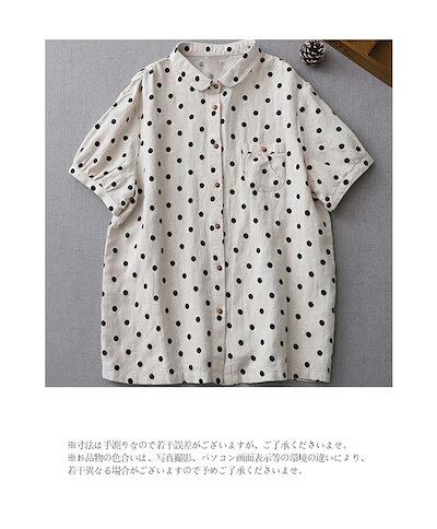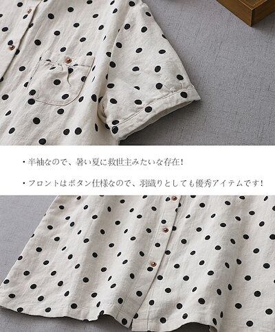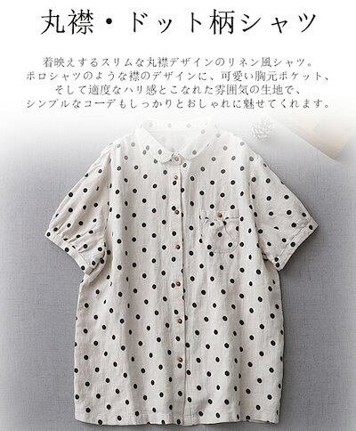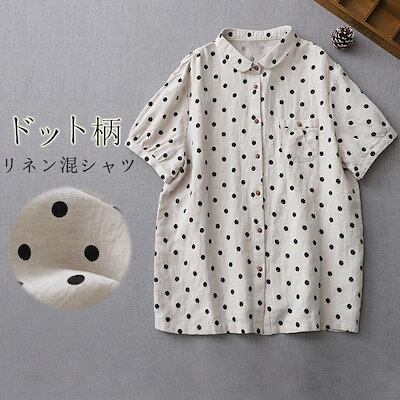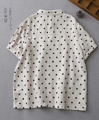 マルエリ リネン シャツ ブラウス 半袖 レディース 丸襟シャツ ドット柄 ゆったり 可愛い 襟付きシャツ 丸襟 前開き ボタン止め ドット柄シャツ ふんわり 通気性 ゆるシャツ トップス 体型カバー