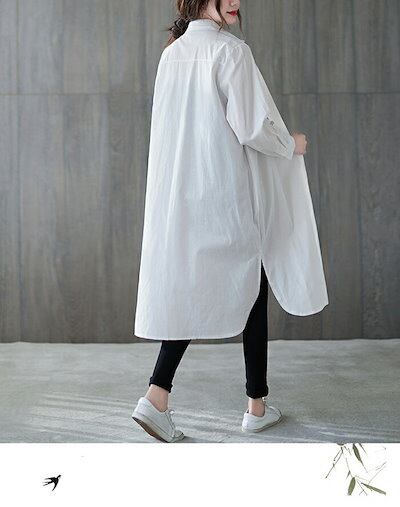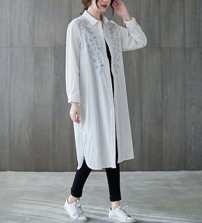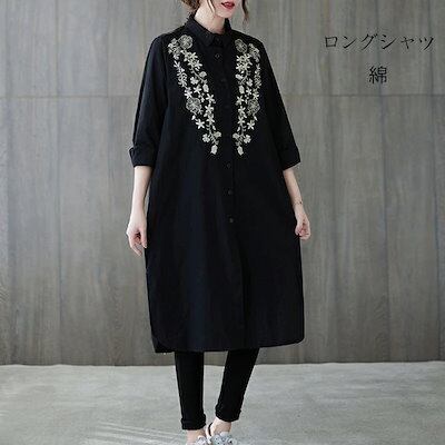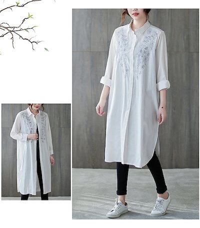 シャツ ロングシャツ レディース フォーマル トップス チュニック 長袖 綿麻混 コットンリネン Aライン らぎゅ 花柄 ボタン付き 白 ホワイト 大きめ