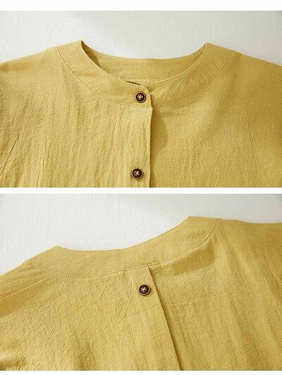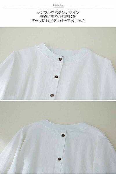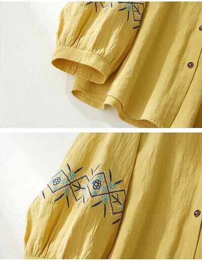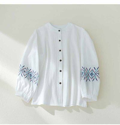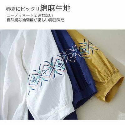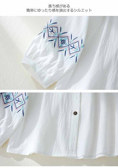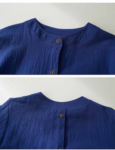 綿麻シャツ レディース 丸首 刺繍ブラウス バックボタン ボリュームスリーブ シャツ ラウンドネック 体型カバー 刺繍 ブラウス 長袖 レイヤード ルーズフィット トップス 綿麻 軽量 着回し ゆった
