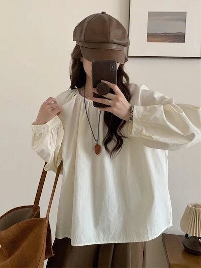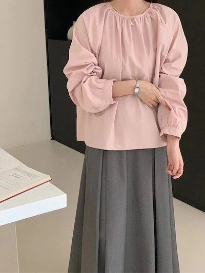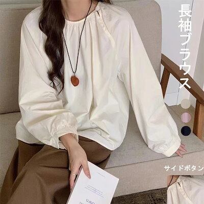 長袖ブラウス レディース タック ブラウス シャツ トップス オフィス 長袖 スーツ インナー 丸首 プルオーバー ラウンドネック Aライン ぽわん袖 バルーン袖 ボタン付き コットン 白シャツ 無地