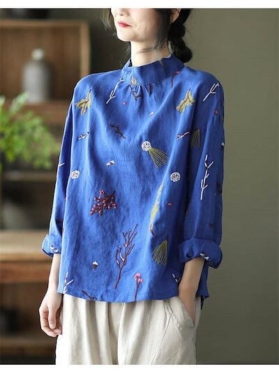 長袖シャツ リネンシャツ 綿麻シャツ シャツブラウス 刺繍 レディース トップス リバーシブル 通気性 バック開き ボタン留め 春秋 カジュアル 30代 40代