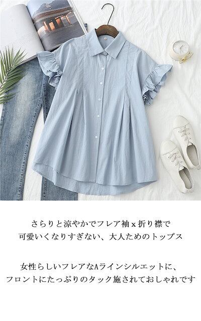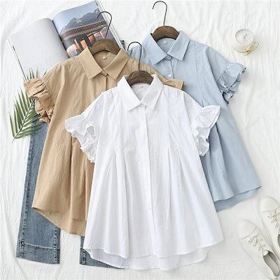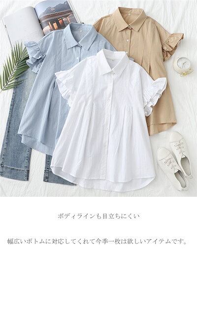 シャツ ブラウス 半袖 レディース シャツブラウス 白シャツ 折り襟 綿シャツ 綿 半袖シャツ フレンチスリーブ フリル フレア 前後差 アシンメトリー 不規則裾 ボタン止め 夏シャツ トップス 大き