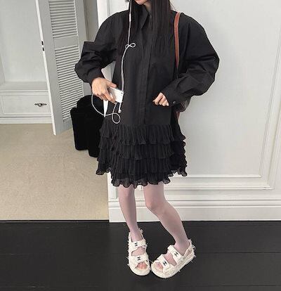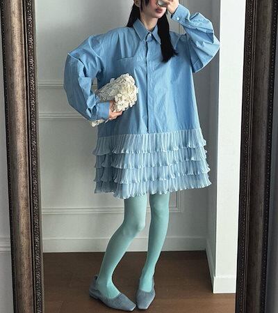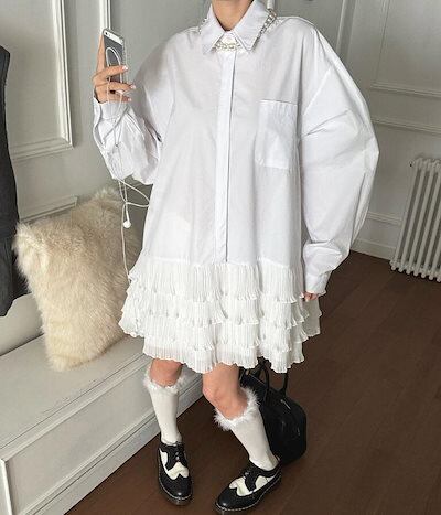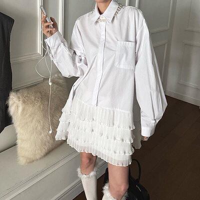 チュニック シャツワンピース ロングシャツ レディース 折襟 チュニックワンピース トップス 長袖 レース ティアードスカート 切り替え Aライン 無地 ボタン付き 白 ホワイト 大きめ 30代 40