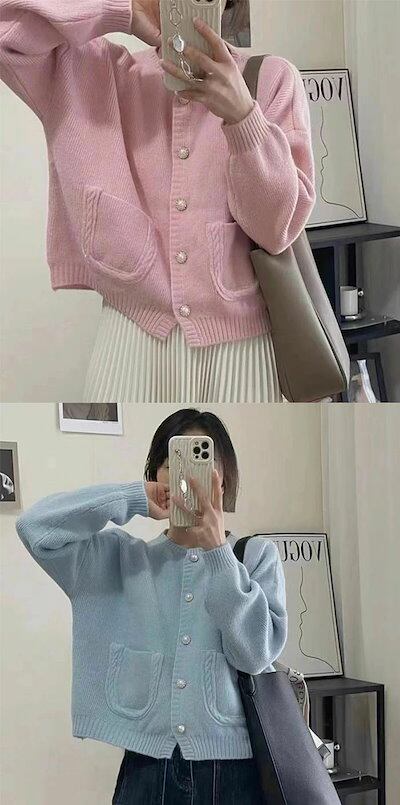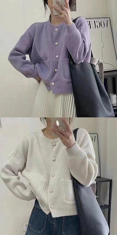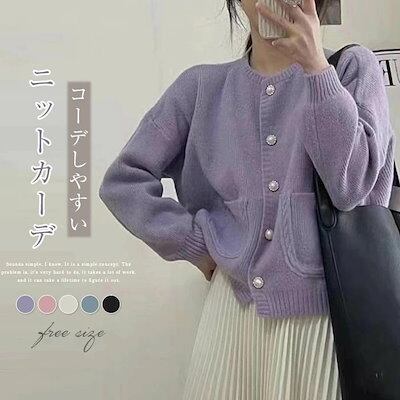 ニットカーディガン レディース ニット カーディガン 無地 トップス 羽織 アウター クルーネック 前ボタン ポケット ゆったり ビッグシルエット エレガント フェミニン 女性 暖かい カジュアル シ