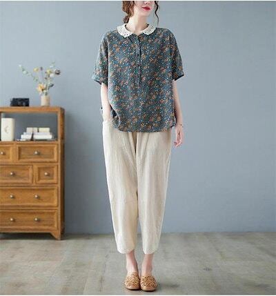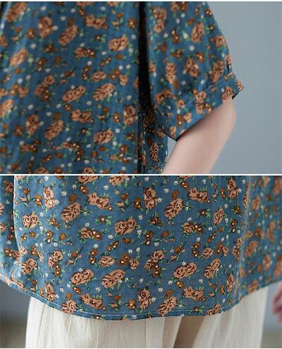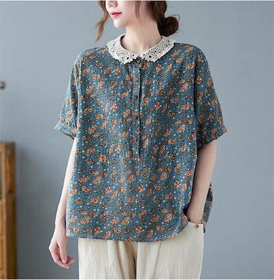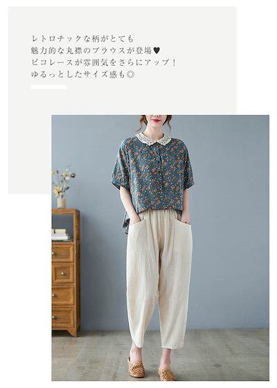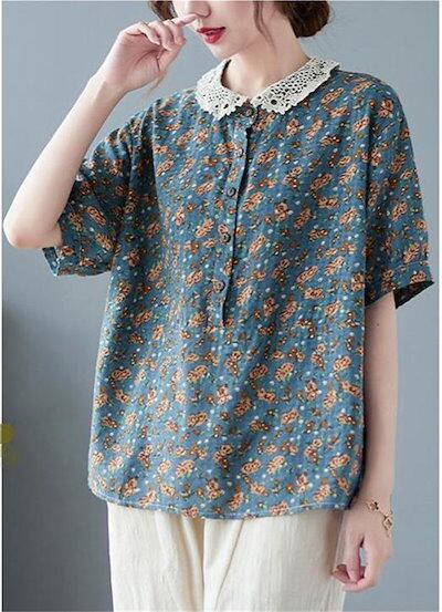 総柄 シャツ レディース 半袖 シャツブラウス 半袖 トップス 花柄 レース 丸襟 夏 半袖シャツ 可愛い 大人 カジュアル ボタン付き レースネック 大きいサイズ 体型カバー ゆったり 綿麻風 通勤
