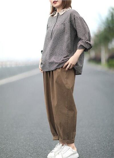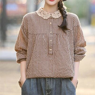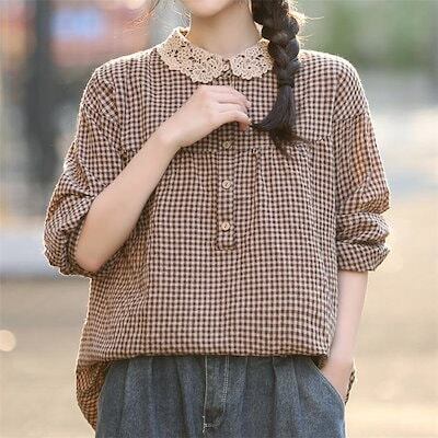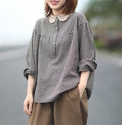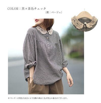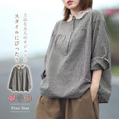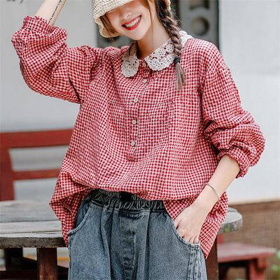 レース丸襟 シャツブラウス かわいい レディース 春秋 シャツ ブラウス 長袖 トップス 綿混 カジュアル 春トップス 秋トップス チェック 切り替え ギャザー ボタン 大きいサイズ 体型カバー 通勤