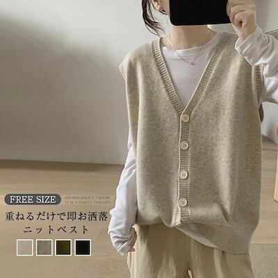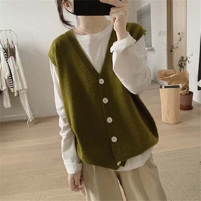 ニット ベスト レディース 春 秋 vネック 前開き ニット ベスト トップス 重ね着 ベスト ノースリーブ レイヤード風 無地 シンプル カジュアル おしゃれ 着回し 体型カバー ナチュラル 送
