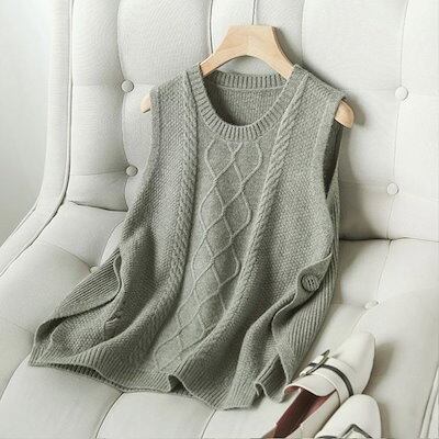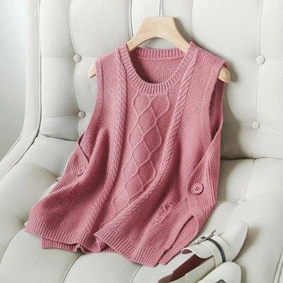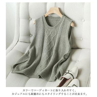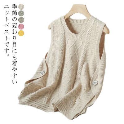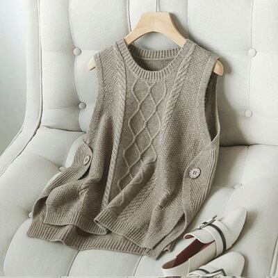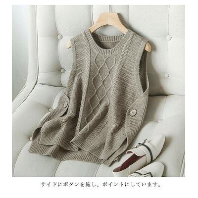 (風吹)大好評 レディース 秋 ニットベスト ラウンドネック 丸首 チョッキ ベスト 前後差 リブ編み ゆったり 春 サイドボタン 冬 レディース Uネック おしゃれ