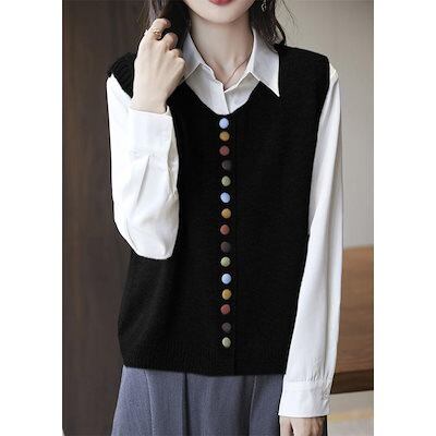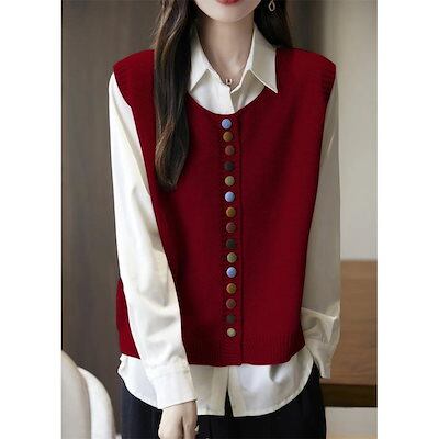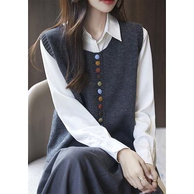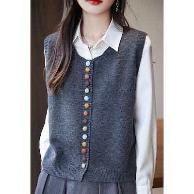 人気新作 カラフルボタン ニットベスト レディース 春 冬 ニット ベスト 前開き トップス クルーネック ショート丈 ノースリーブ 無地 シンプル レイヤード 重ね着 セータ