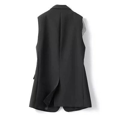アウター トップス ジレ ベスト レディース ロング フリル 袖なし ノースリーブ 黒 ブラック Vネック 襟付き アシンメトリー 春 夏 秋 個性的 フェミニン 前開き 異素材 かわいい 大人