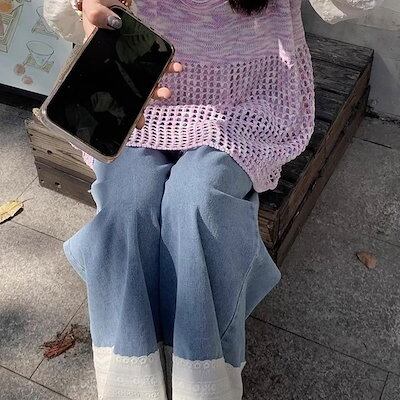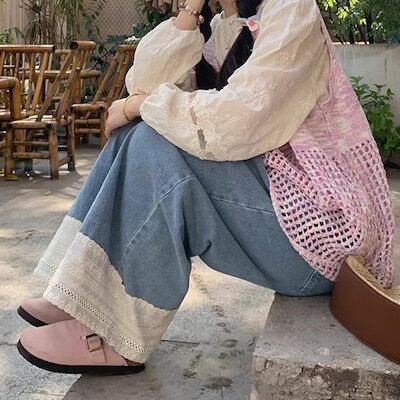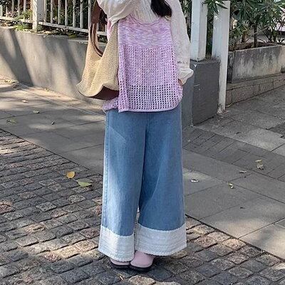 2024春夏パンツ デニム ジーンズ ワイド ストレート レース ハイウエスト 脚長効果 美脚効果 細見え 春 ブルー 青 カジュアル おしゃれ かわいい シンプル 韓国ファッション レディース お出