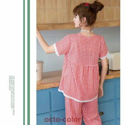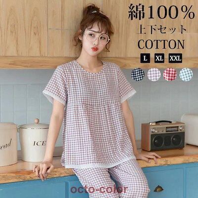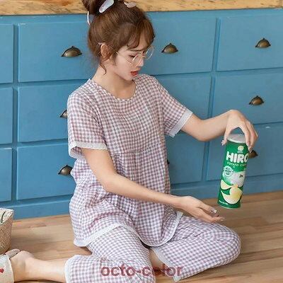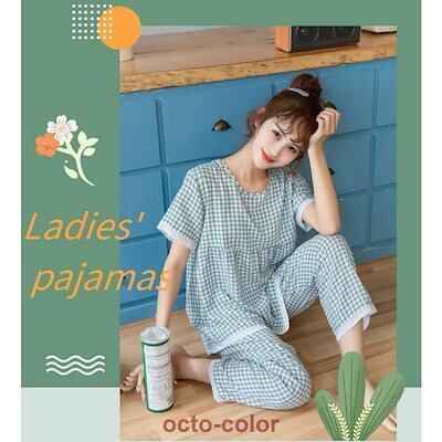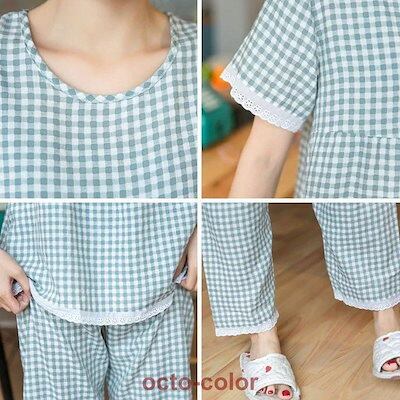 パジャマ レディース 春夏 綿100% 半袖 前開き ルームウェア 可愛い 韓国 チェック ロングパンツ 2点セット セットアップ 敏感肌用 かわいい 入院 20代30代