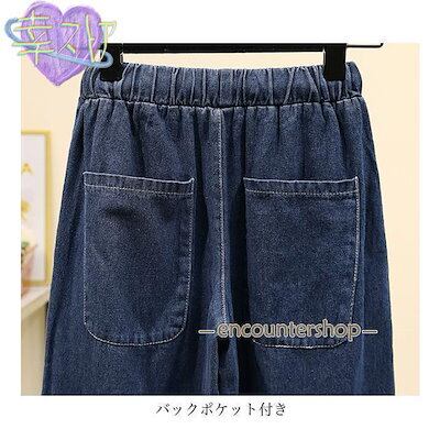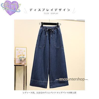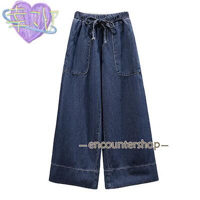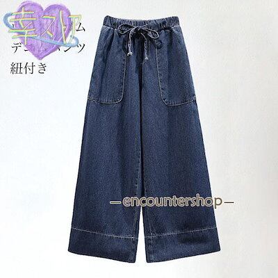 デニムパンツ レディース ワイドパンツ 無地 九分丈 紐付き ポケット付き ウエストゴム 柔らかい ゆったり 美脚 春夏秋 お出かけ