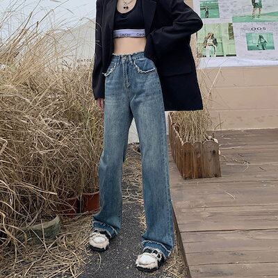 2024春夏 新作 レトロ 着痩せ デニムパンツ ハイウエスト 流行り ワイドパンツ 気質スラックスパンツ 韓国ファッション スキニーパンツ 脚長効果! ひんやりボトムス