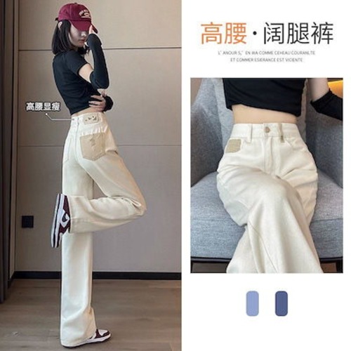 春秋新作 ガウチョパンツ ハイウエスト ストレートジーンズ やせて見える あちこち アンズ色 ズボン本 ワイドパンツ レディース