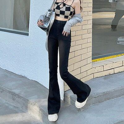 春秋新作 ガウチョパンツ ジーパン ブラック ハイウエスト 身を修める ラッパズボン ワイドパンツ レディース