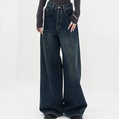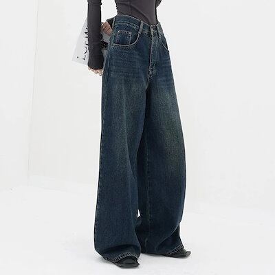 デニムパンツ アメリカンスタイル レトロ ダークカラー ストレート ジーンズ レディース 25新作 大きいサイズ ルーズ 百掛け ワイドパンツ 韓国