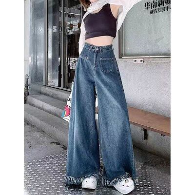 ワイド ストレートロングパンツ ハイウエスト デニム フリル レディース 秋の新作スリムフリンジ