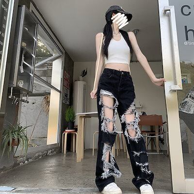 ジーンズ 新作 スパイスガール ブロークン・ホール ジーンズ レディース 大きいサイズ ファット・シスター ハイウエスト 薄手 ワイドパンツ ストレートパンツ ?国ファッション